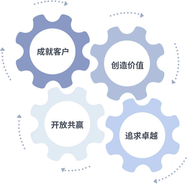 成就客户是一切决策的出发点,,,创造价值是衡量所有工作的标准,,追求卓越是我们做事做人的态度,,开放共赢是我们的格局也是最终的结果。。。价值观的齿轮环环相扣,,,,推动着组织里的每个人不断向前。。。。