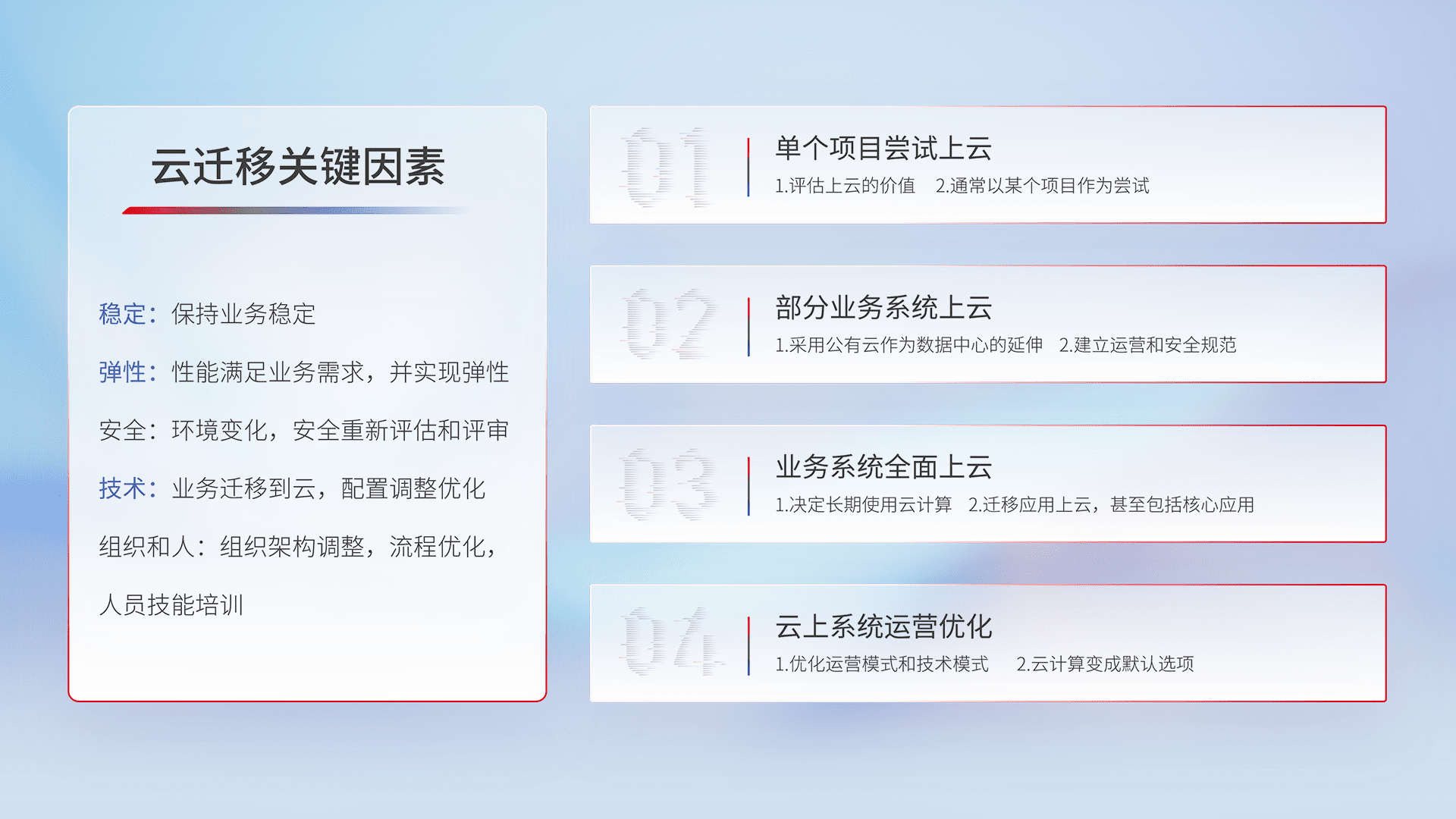 结合实际业务,,从规划设计、、、云平台选型、、云原生改造、、、数据迁移、、、、集成交付,,,迁移全过程为客户识别最佳上云路径,,做好风险识别管理,,,,设计网络架构、、、、身份权限、、安全审计合规、、操作审计、、日志审计、、、、监控告警策略、、、多站点容灾设计等,,对云上基础设施进行整体规划,,提升IT治理水平,,,以满足弹性、、、高可用、、、高性能的需求。。