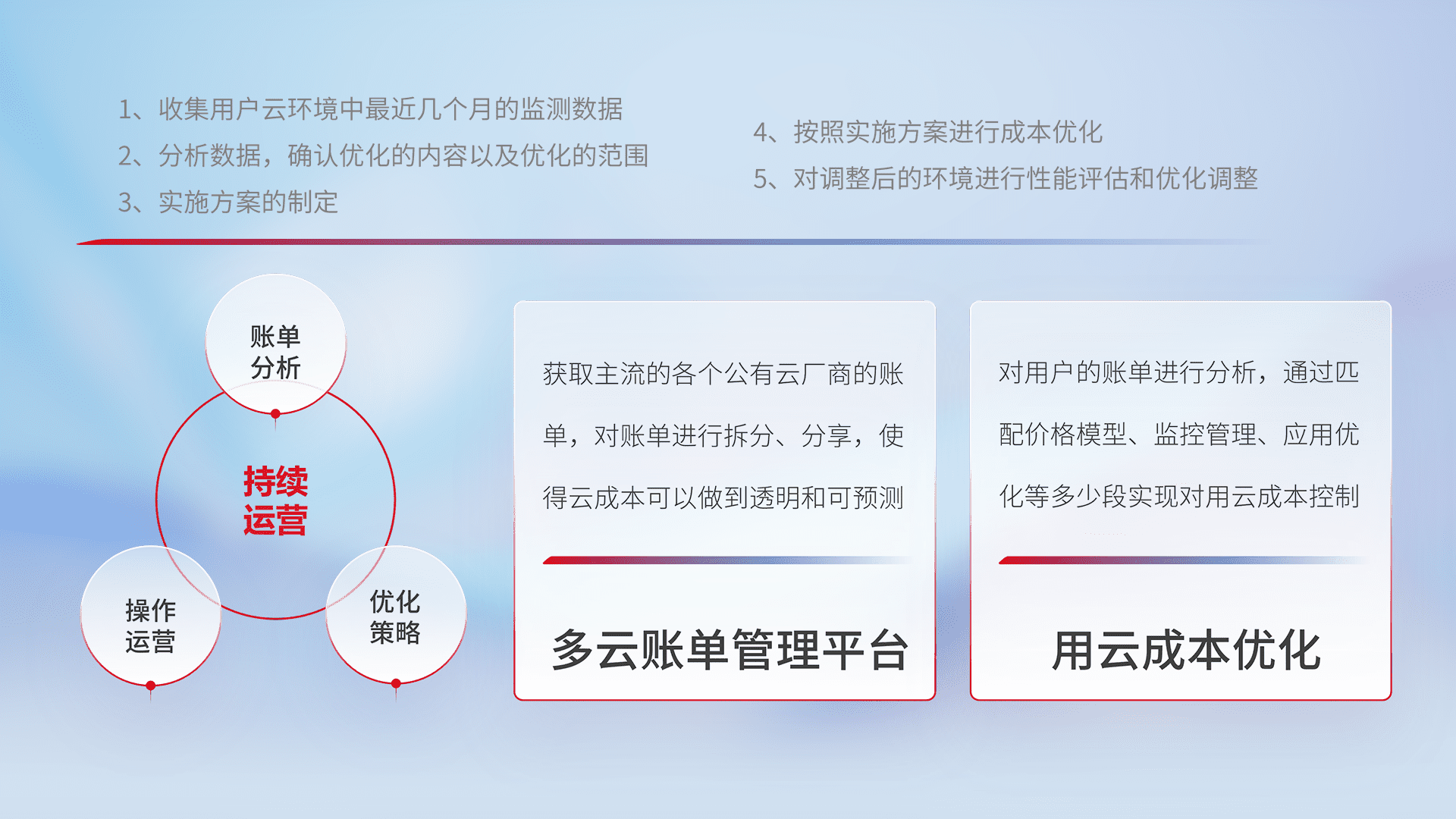 通过多云纳管,,以统一的资源数据模型把客户的云资源进行抽象和封装,,,进而实现对多云资源的统一操作,,,,保障云资源管理的可靠性、、稳定性与可用性。。量身定制化运维内容,,,配置、、、开发运维、、、、补丁管理、、、、备份、、、监控、、认证和访问管理、、审计和日常巡检等,,,,保障在用云过程中的可靠度,,稳定度以及高可用率。。。。