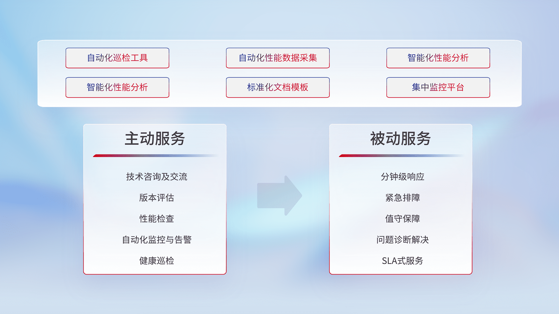 智能化工具和标准化文档,,保障服务质量,,提供主动服务(包含技术咨询、、、版本评估、、、、性能检查、、、自动化监控与告警、、、健康巡检)和被动服务包含(分钟级响应、、、、紧急排障、、、、值守保障、、、、问题诊断解决、、、、SLA服务)。。。